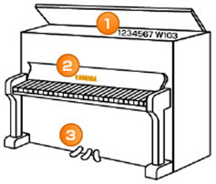 事前に、ピアノのメーカー、品番、製造番号をお調べください。 品番・製番の見方は下の図を参考にしてください。 もしわからなくても大丈夫です。安心してご連絡ください。